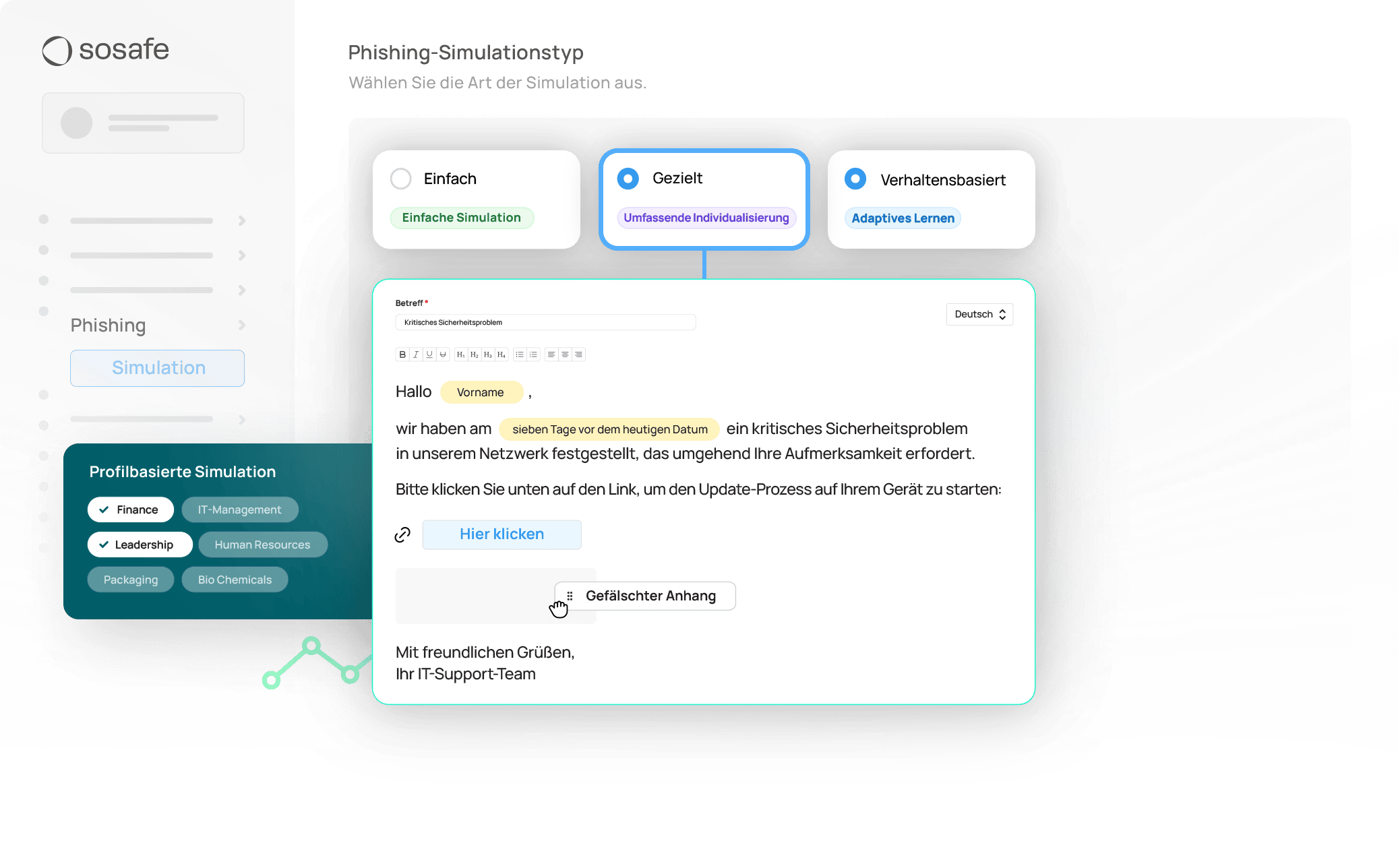 SoSafe schult, sensibilisiert und testet Mitarbeiter von Unternehmen rund um das Thema IT-Sicherheit durch simulierte Phishing-Kampagnen, kurzweilige Videos und eine interaktive E-Learning-Suite.